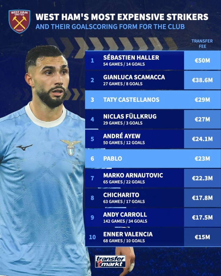 1月5日讯 在菲尔克鲁格离队后,西汉姆联速即签下了巴勃罗·费利佩和瓦伦丁·卡斯特拉诺斯,数据统计涌现他们也位列铁锤帮队史最贵时尚榜前六。