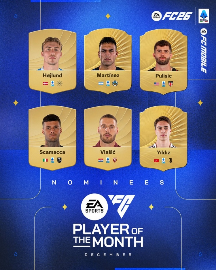 1月8日讯 意甲官方公布了12月最好球员候选名单,霍伊伦、劳塔罗、普利西奇、伊尔迪兹在列。