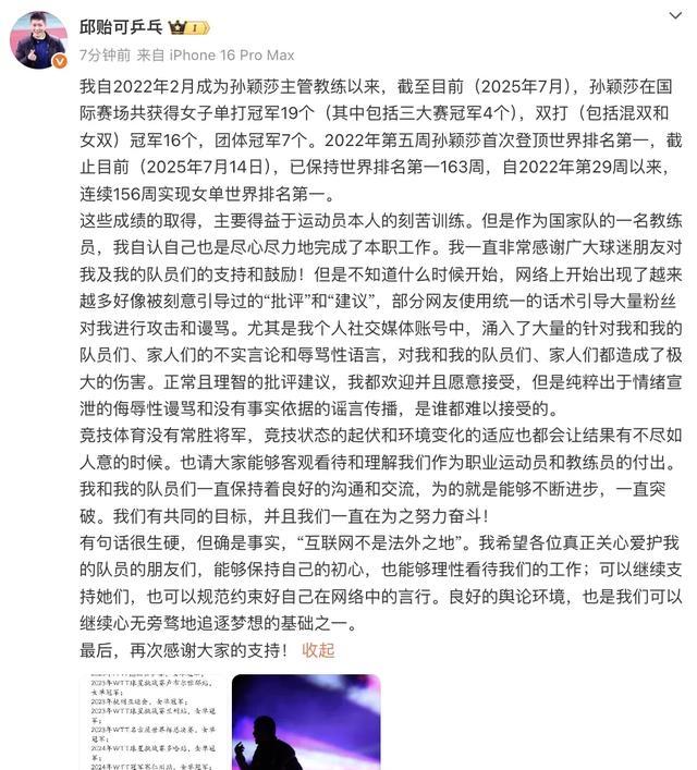 第一顶,叫“元气心灵分派不公”。意旨风趣是邱贻可偏心眼,把心想齐花在考研蒯曼这块璞玉上了,荒原了莎莎。这脑回路,清奇得让东谈主誉络续口。我就麻烦了,一个火头,用消除口锅炒出了两谈国宴级名菜,你们不去夸他火候掌持得妙,反而揪着他问“你炒第二谈菜的时期是不是偷吃了第一起的配料?” 孙颖莎和蒯曼,一个右手一个左手,时间基础底细、躯壳要求能相同?邱贻可干的,是给莎莎这把“绝世好剑”开最横蛮的刃,给蒯曼这块“奇石”找到最惊艳的雕镂面。这叫因材施教,是教悔才气的巅峰体现。到了有些“懂王”粉丝眼里,成了零和游戏,成了“移东补西”。合着在你们那,一个教悔就只可盯一个东谈主,其他队员该死自生自灭?那国度队要那么多教悔干嘛,一东谈主配一个私教得了。